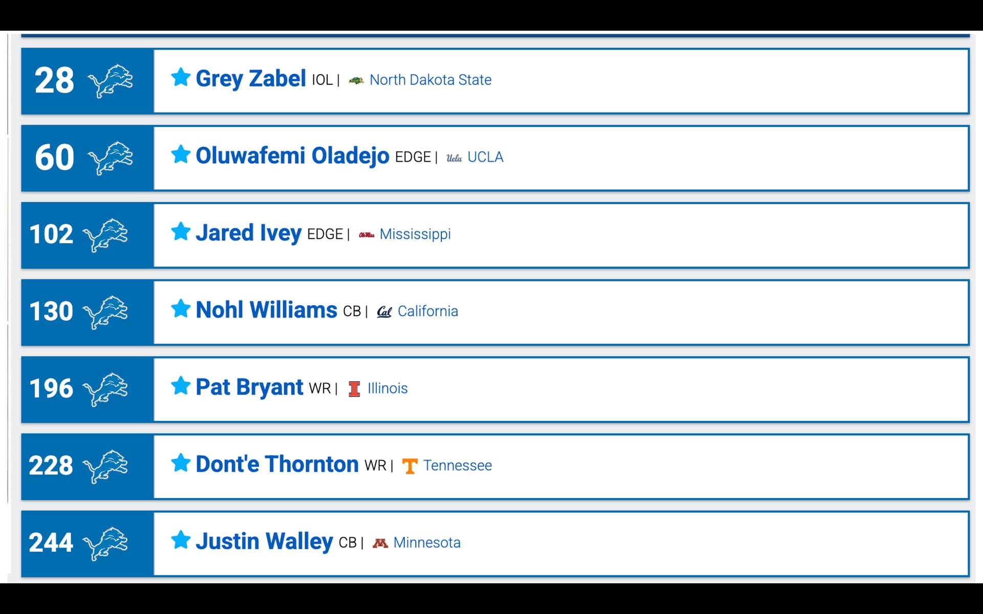 My mock draft this week. Shamelessly jumping on the Oladejo hype train! And a silly swing for Thornton late on day 3!