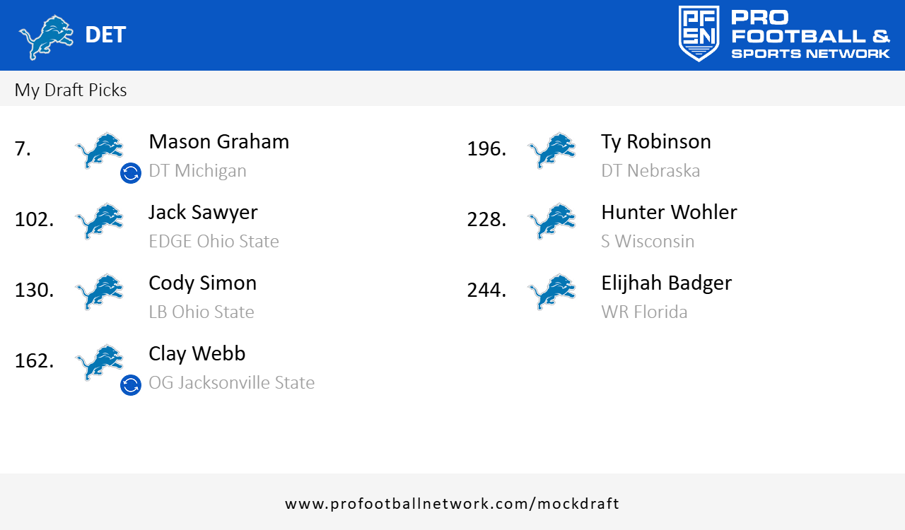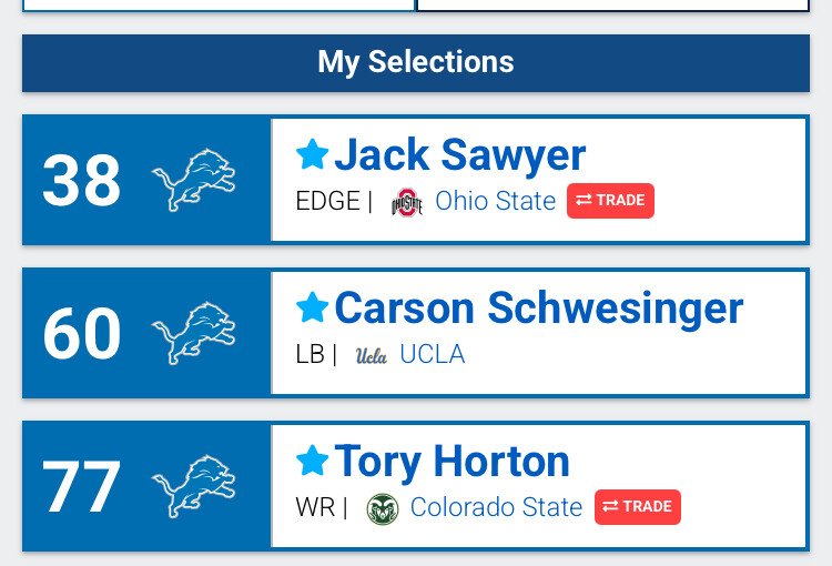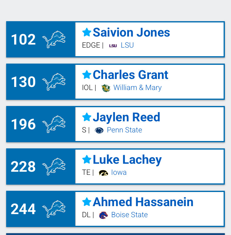 Love the first 4… Schwesinger is a stud, Sawyer is a solid #2 DE, Horton is Josh Reynolds 2.0, and, well, you know how I feel about Jones… I’d be ecstatic