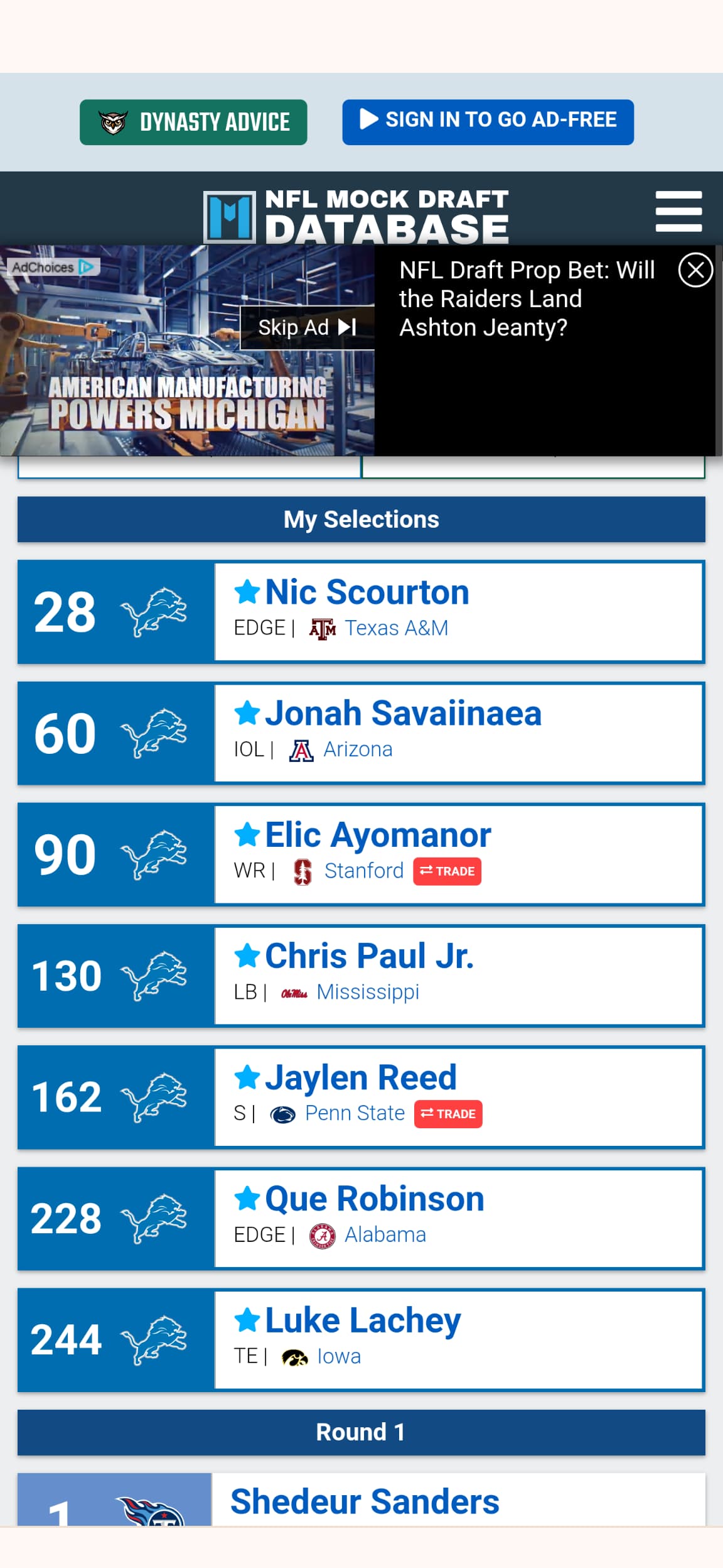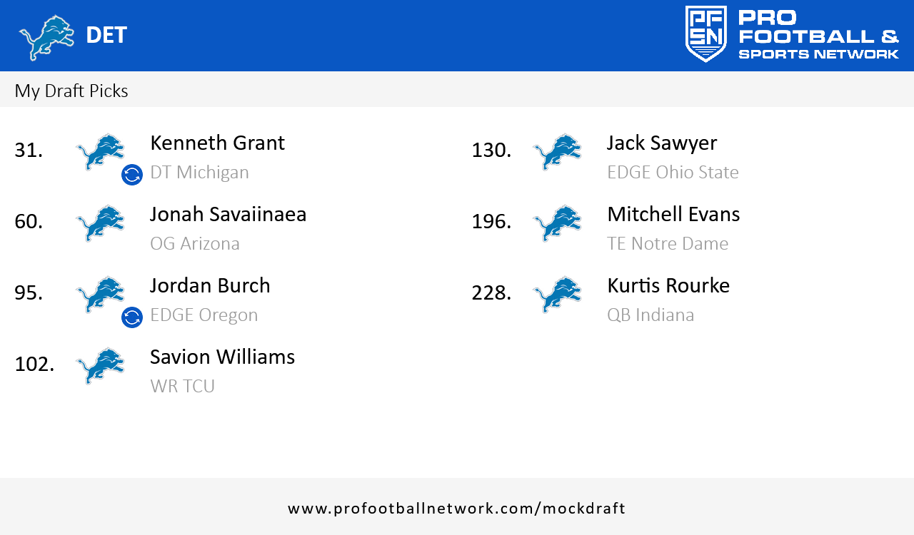 Ok so Carter fell to 5 and I had to go get him. We give up our 1st next year. I figured we are going all in and I also traded up for Zabel. Tuten can return kicks and fill in for Gibbs or Monty and Vaki can have the 3rd downs. Roberts is a power edge that can get home. Trader is an over the top safety who will come up and tackle. Toia is a 330 lb NT who plays more like Alim than Reader and takes over next year. I would give up the 1 next year for this draft but I actually overpaid to go up and get Zabel.