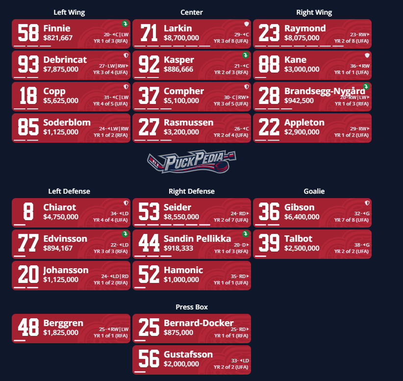 20-year-old Emmitt Finnie (7th round, 2023) will be playing on the first line with Larkin and Raymond. 20-year-old Michael Brandsegg-Nygård (1st round, 2024) is slated to join the 3rd line with Copp and Compher. And 20-year-old Axel Sandin-Pellikka (1st round, 2023) will paired with Simon Edvinsson.