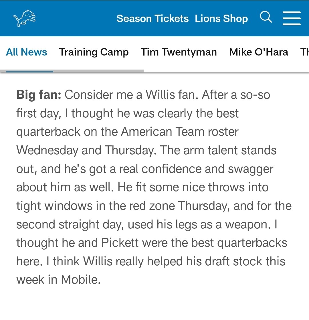 And the Lions only get one shot at this with this rebuild so they need to be ‘#2 sure’ at least. It takes at least 2-3 years to get someone like Willis ready - assuming he’s even remotely capable - which most people think he isn’t.
