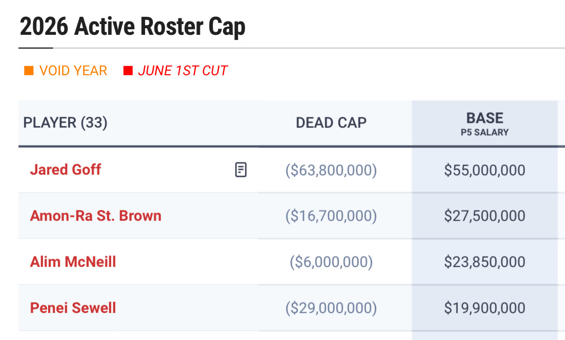 Lions could easily restructure any amount of over $125,000,000 in base salary from only 4 players and move that money into future years.