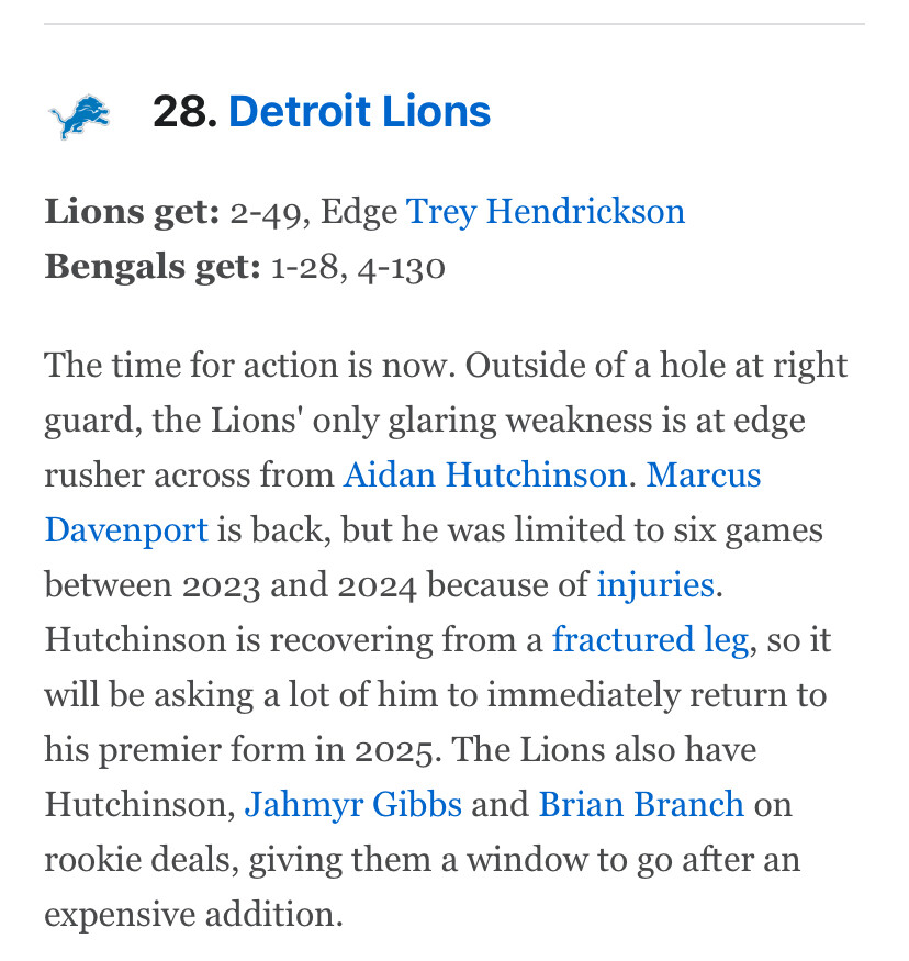 I just dont know how we pay him and Hutch. Im not a draft nerd guy, bit if theres a stud near the top of the draft, why not trade up and go for him instead? They are in the weird position of having drafted too many good players. I feel like they can part with beans easier than trying to squeeze that extra high end contract in.