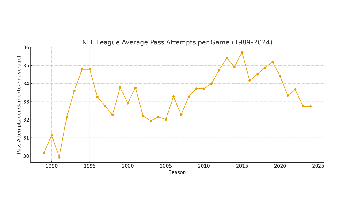 I went back and looked and passing attempts per game really haven’t changed that much over the last 35 years - 1989 (30 PA/G) versus 2024 (33 PA/G). Rules have made it easier for offensive players for sure… which intuitively should make interceptions slightly more difficult today than when Benny Blades played. Interception leaders since 1989 typically had between 7 and 10 interceptions per year, with 9 or 10 being the most prevalent. I would also say that passing game schematics have really improved over the past decade, again potentially making interceptions more difficult now.