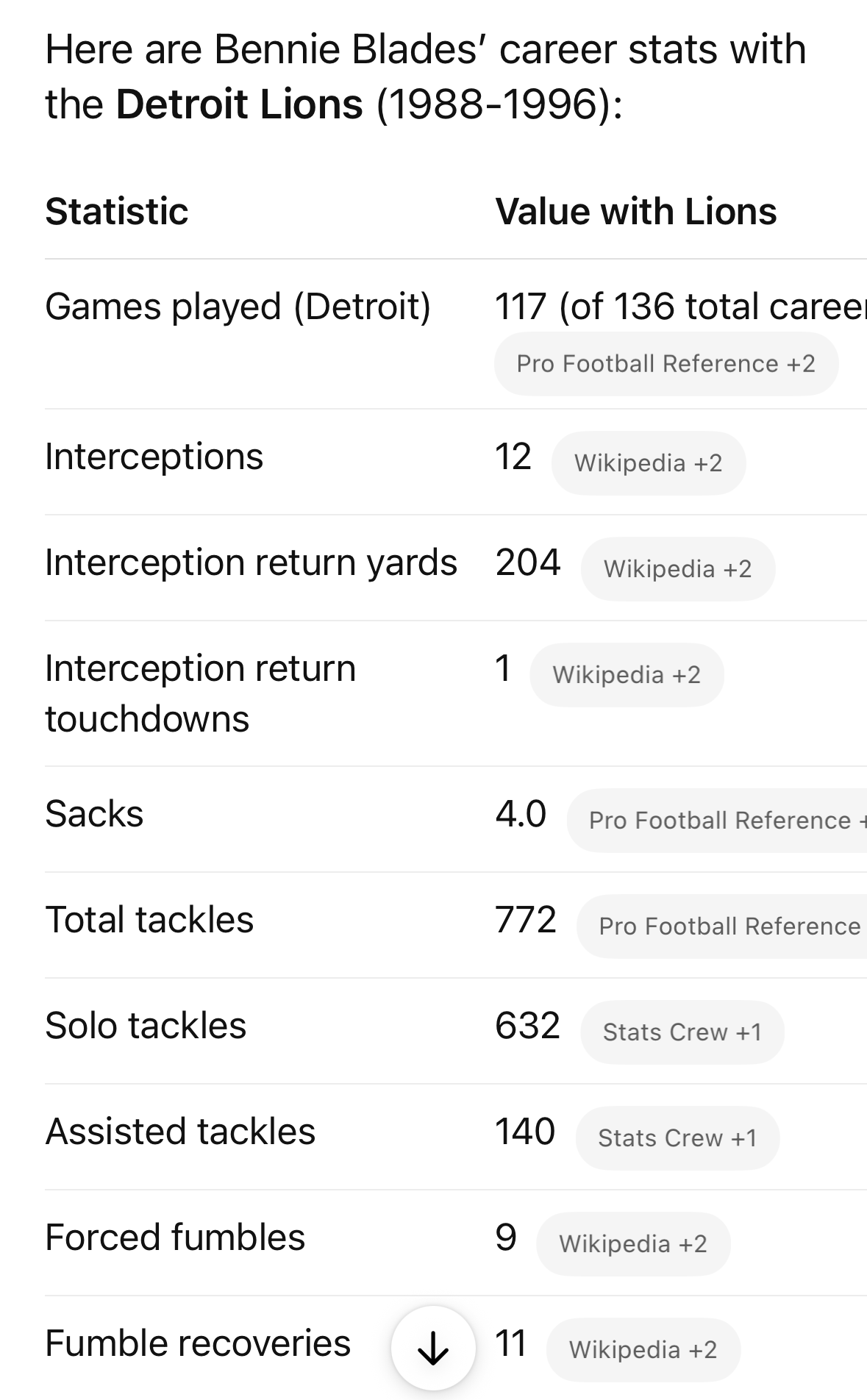 I looked up Benny Blades stats. In the 8 seasons he was with the Detroit Lions he had 4 sacks, 9 forced fumbles, 14 interceptions and one touchdown. I know he was a big hitter and I also know he made three all pro teams, but these stats are rather pedestrian in my opinion. I would be disappointed if he ends up being voted as our top safety of all time.