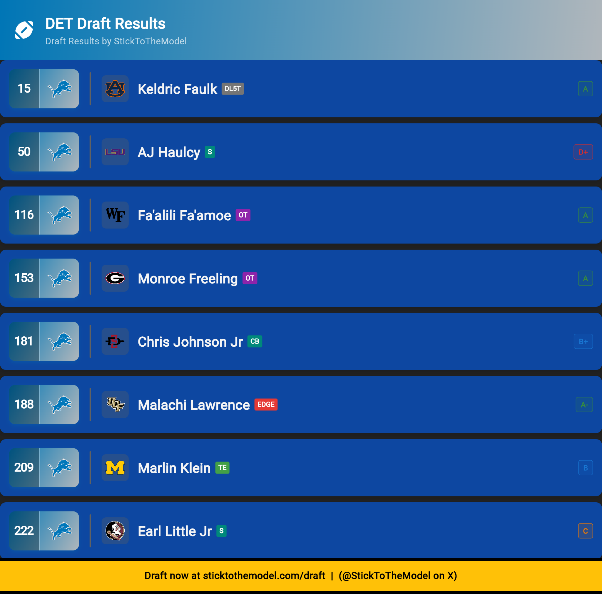 Stick to the model is probably my second fave, but there are a couple of things I really like about mock draft hero: the whoopsie button (that’s what he calls it, where you can back out picks), and the ability to explain each pick. Good for making full mocks for others.