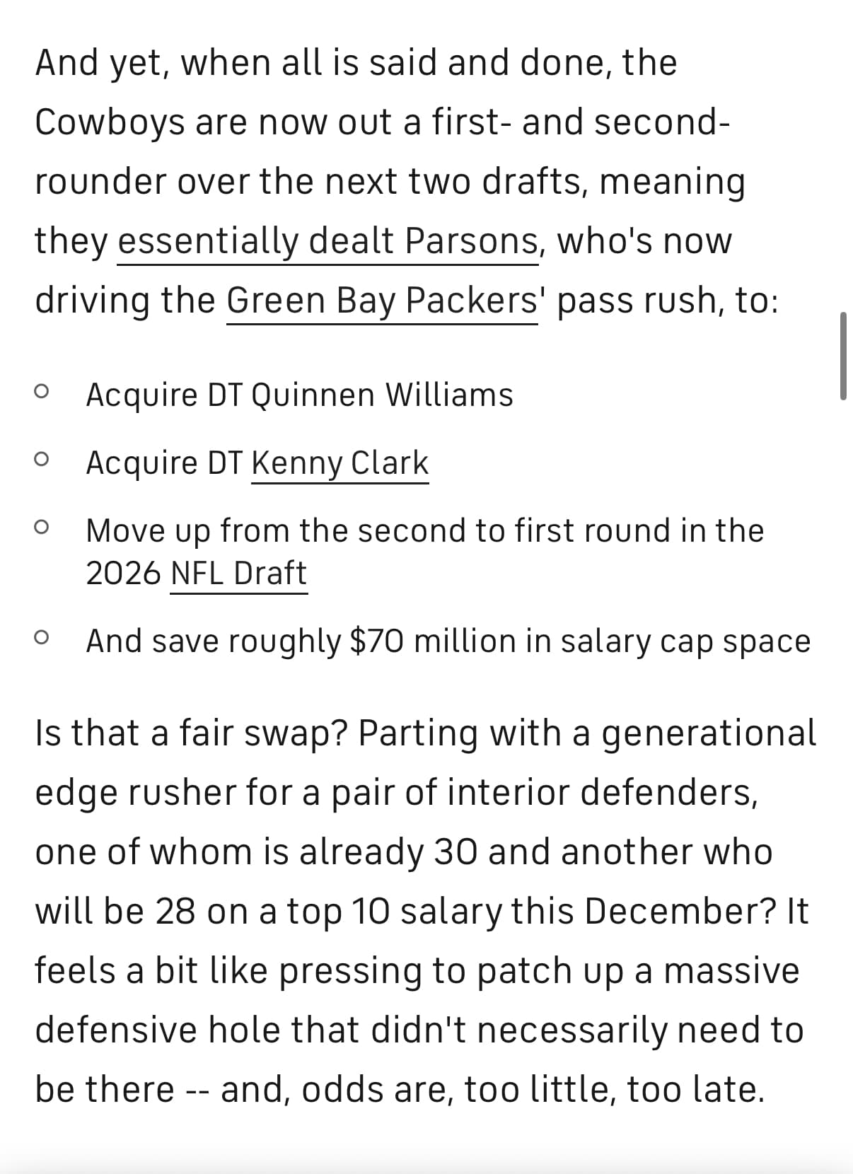 Itâs exactly what Cleveland and the Raiders should be doing but are content being forever shitty with their aging star edge rushers as their only really good players and no future capital to build the next rebuild