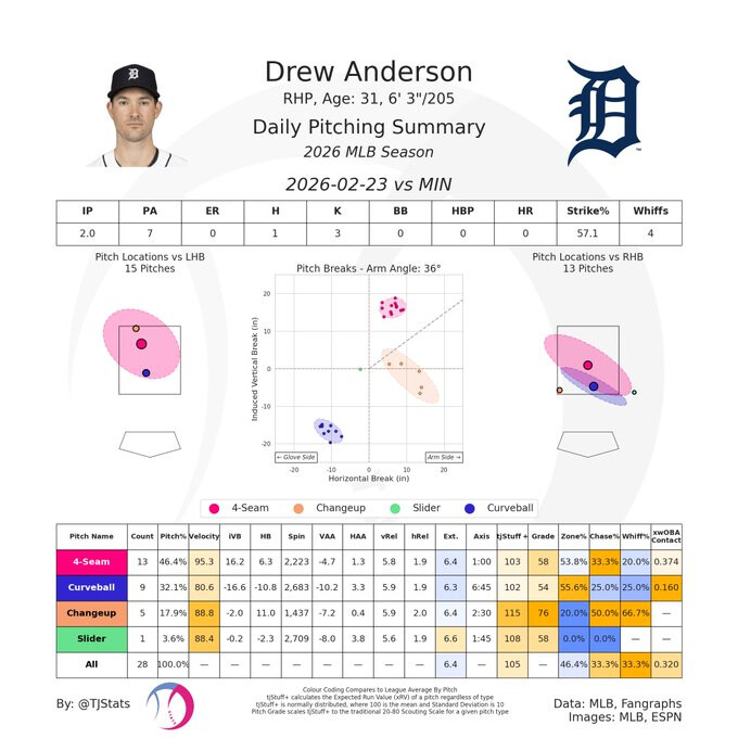 After excelling overseas for 4 seasons, Drew Anderson made a strong impression in his return with 2 scoreless innings. His fastball exhibited above average ride at 95 MPH which paired wonderfully with a massive tumbling changeup and huge looping curveball