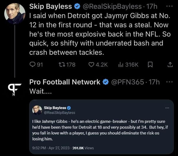 The step to the outside at around the 36 yard line and the cut back inside around the 32 yard line is a great example of what made/makes Gibbs special. That ability is one of the things that was highlighted in the pre-draft reports.
