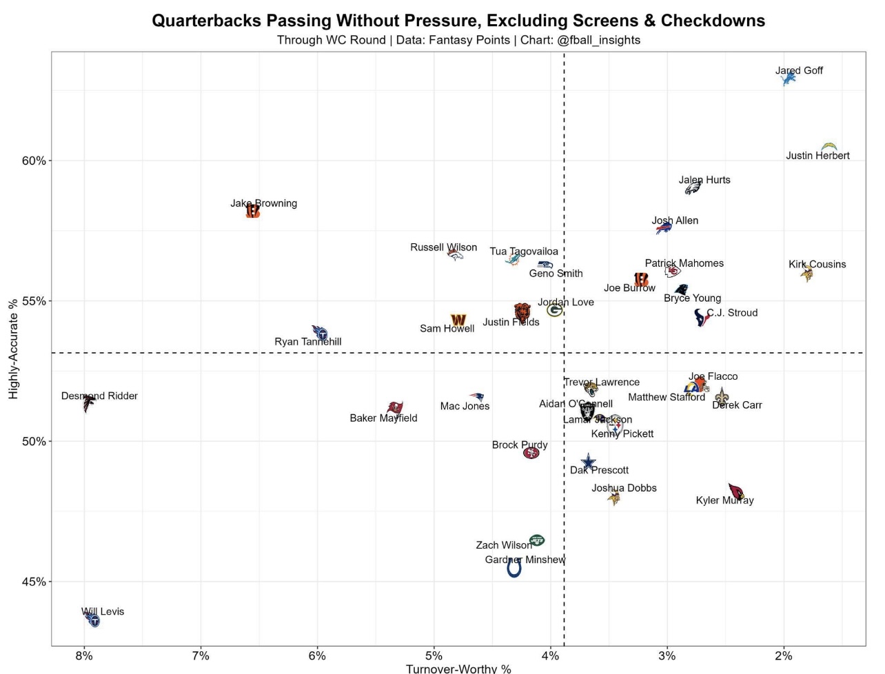This year at least, Jared Goff is the most accurate and top-3 least “turnover-worthy” QBs in the league when kept clean. Among all QBs when kept clean, he’s probably the best. That’s amazing.