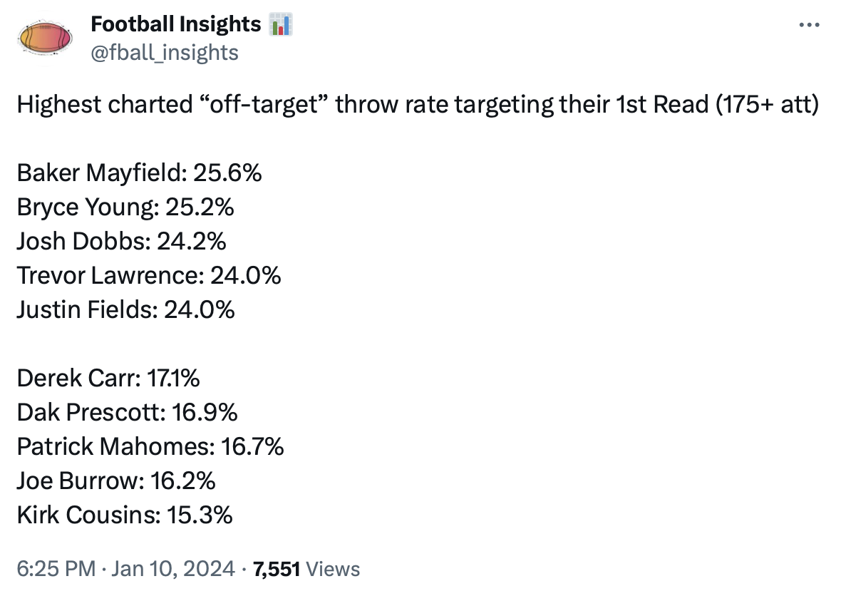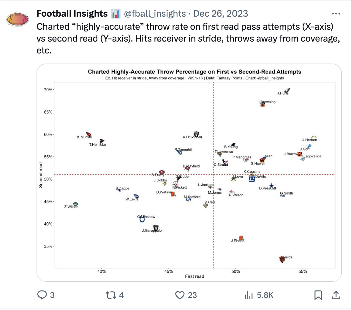 Goff 2nd-most “highly accurate” when throwing to his first read (just behind Hebert); 8th-most “highly accurate” throwing to his 2nd read. Interesting that a few guys, like Hurts and Murray, are MUCH more accurate to their 2nd reads than to their first.