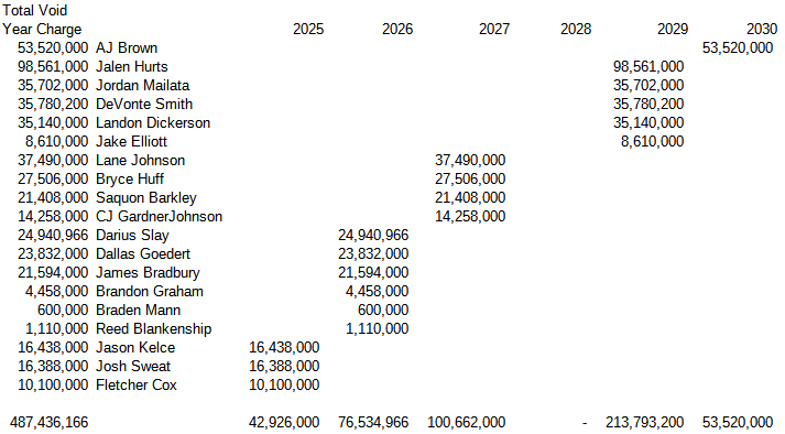 This was Philly’s projected void year hits for players not under contract. (I think Mailata’s contract and someone elses didn’t transfer to Nick’s post, because a salary is listed under Mailata instead of Void).