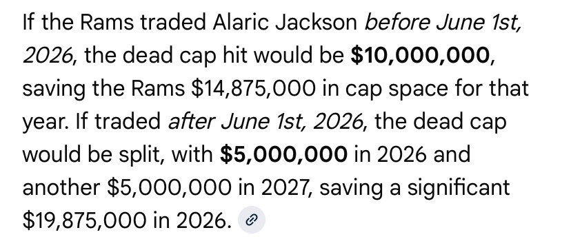 Trade for Alaric Jackson? Or McClendon if the Rams prefer Jackson? I assume that McClendon will get a second round tender. Perhaps the Rams are planning to flip one and let Havenstein test FA. In that case Havenstein is an interesting stop gap if we flip Penei.