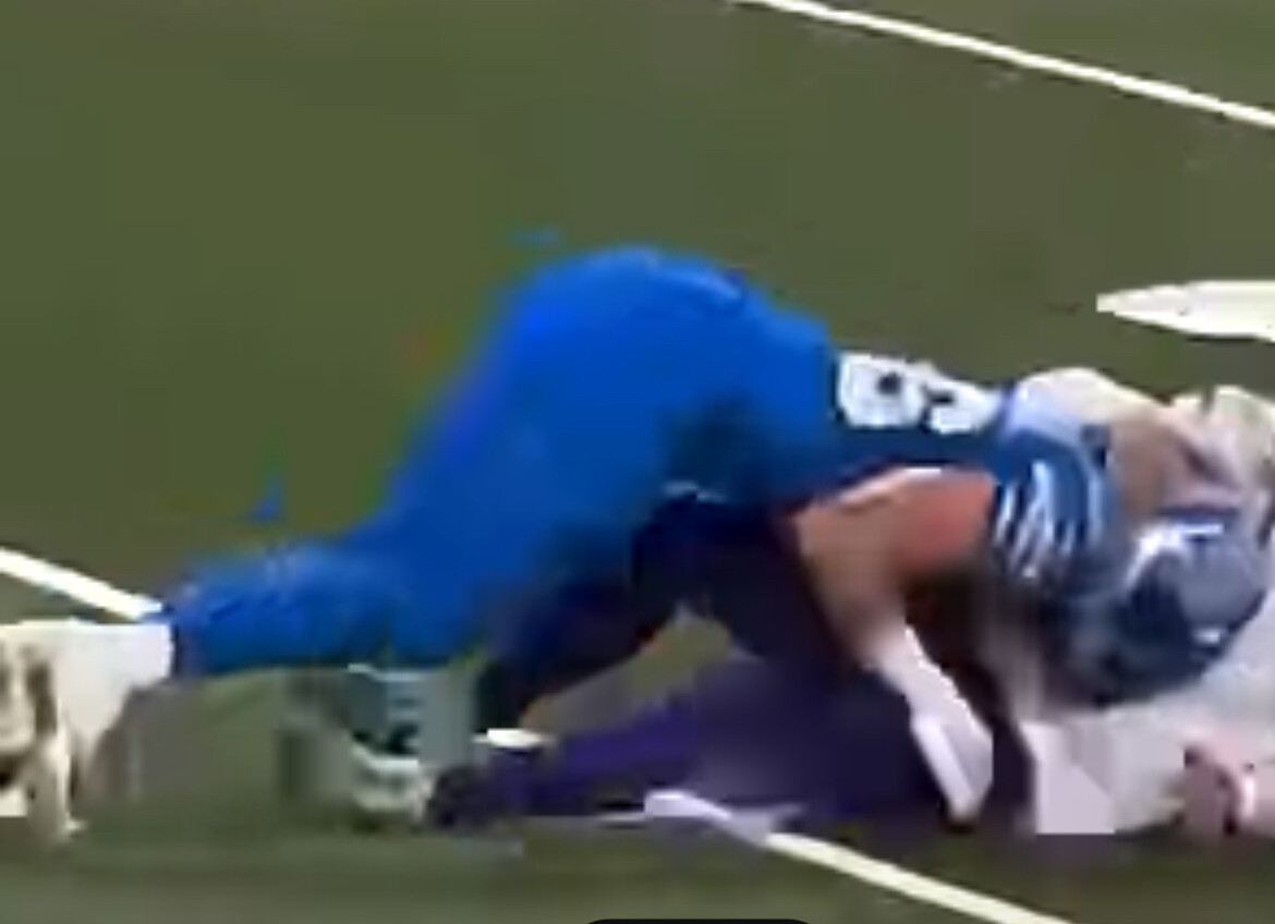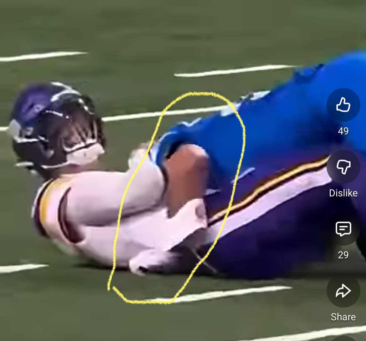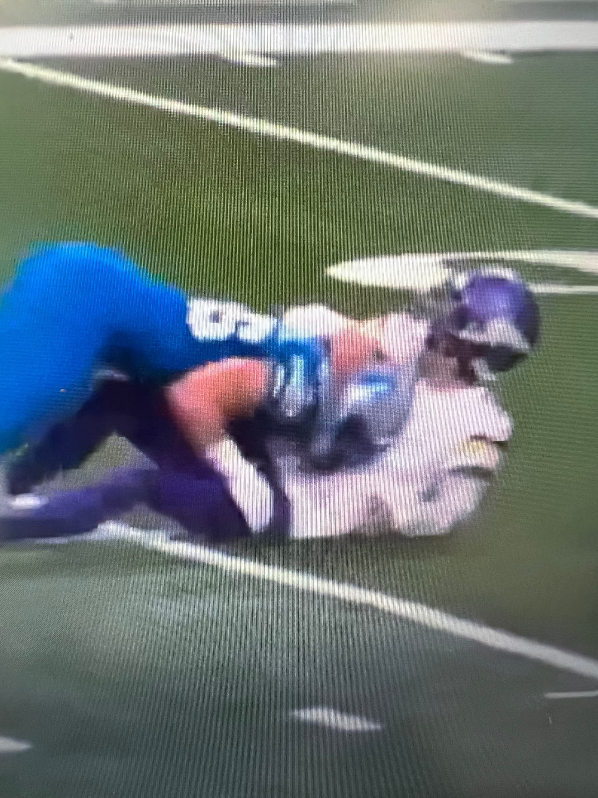 I’m looking at your still shots Phunny, and absolutely have no idea what you’re looking at. I think its the first time in the history of all my Dendom, that I just don’t see it the way you do. Campbell’s hand is around some blue pants (his own) – they’re not purple!! Campbell’s other hand is on the ground, not around McCarhthy. But I guess you see what you see. Watch it in real time. He braced his fall. Clear as day. Peace.