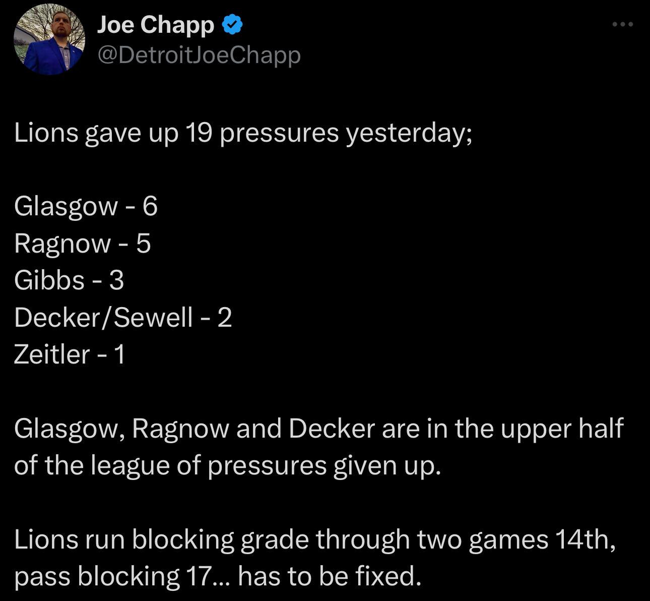 These numbers would probably be drastically different if we didn’t throw almost 60 times and leaned on the running game to wear them out. I’d be curious to see the similarities on pressures from other OLs when their QB throws as much as he did. I’d guess they’re very similar.