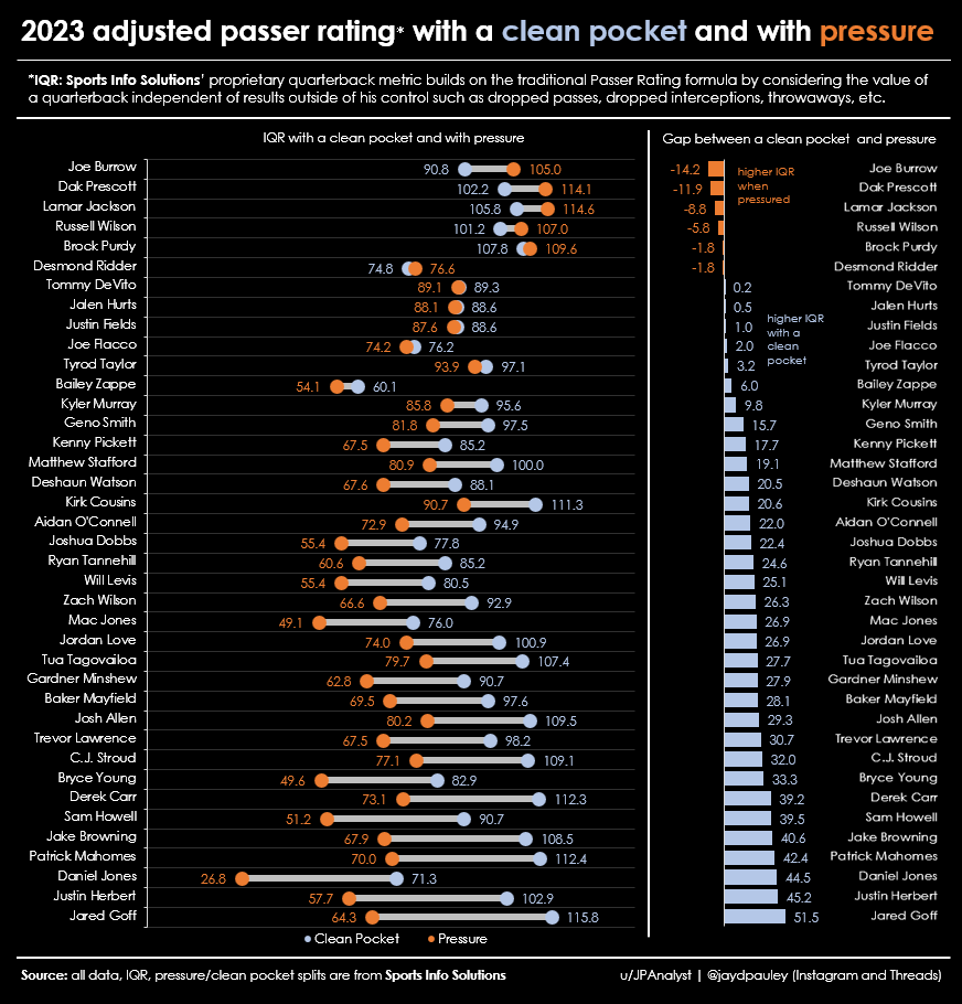 Goff didn’t have the worst IQR under pressure, he just had the worst delta because his clean-pocket rating was so good. The lowest IQR under pressure was Daniel Jones with an adjusted passer rating (IQR) of 26.8. Because his clean-pocket IQR was so abysmal (71.3), he only had the third worst clean-to-pressure drop, despite his league-low 26.8 IQR under pressure. To make matters worse, Jones was under pressure 44.8% of the time, 2nd worst in the league, behind teammate Tyrod Tayor (46.1%). In fact, the top three worst pressure rates in the NFL belong the all three Giants (Jones, Taylor and Devito who is tied for 3rd with J.Fields)"