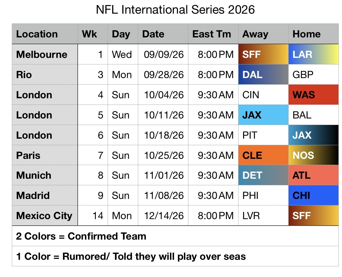 Back in 2024, Philly hosted Green Bay in Brazil – Green Bay kept their 9 home games with only 7 true road games and 1 on a neutral field.