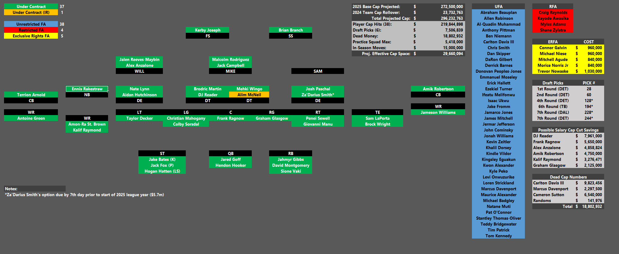 Figured I might as well start looking ahead at 2025 (and beyond). The Lions are obviously in good position. We’re looking at anywhere between 25-35 million in cap space to spend on FAs depending on where the cap lands and how much the Lions want to hold for in-season - this has usually been anywhere from 15-20m each season with Brad.