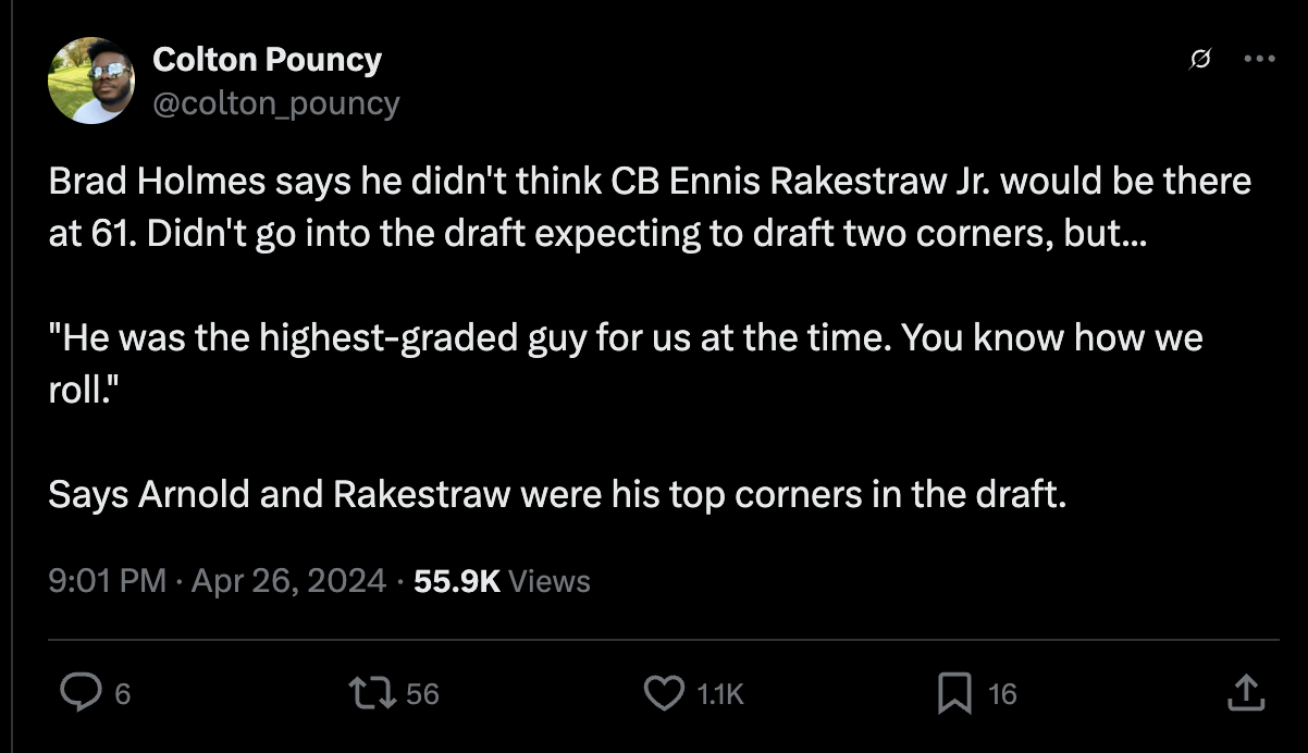 I honestly just think he’s playing his board. Rakestraw was someone often mocked in the 1st, everyone was pretty surprised he was available that late. In fact Brad said as much. DIdn’t expect to draft 2 corners but we play our board.