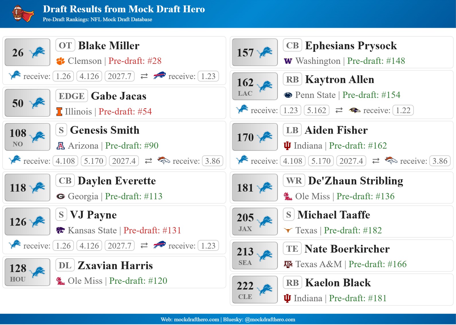 I like the initial trade downs but I would then package the lower picks to move back up to select better players. I’d rather come away with 4 or 5 players that have a real chance to contribute something.