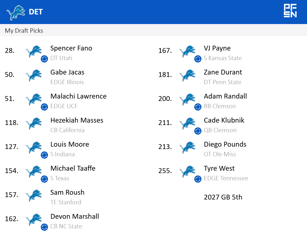 I did do one like Bubba was suggesting, where I got Fano in the late first, then Jacas in the second and used extra picks to move back up into the 2nd and double tap edge with Malachi Lawrence.