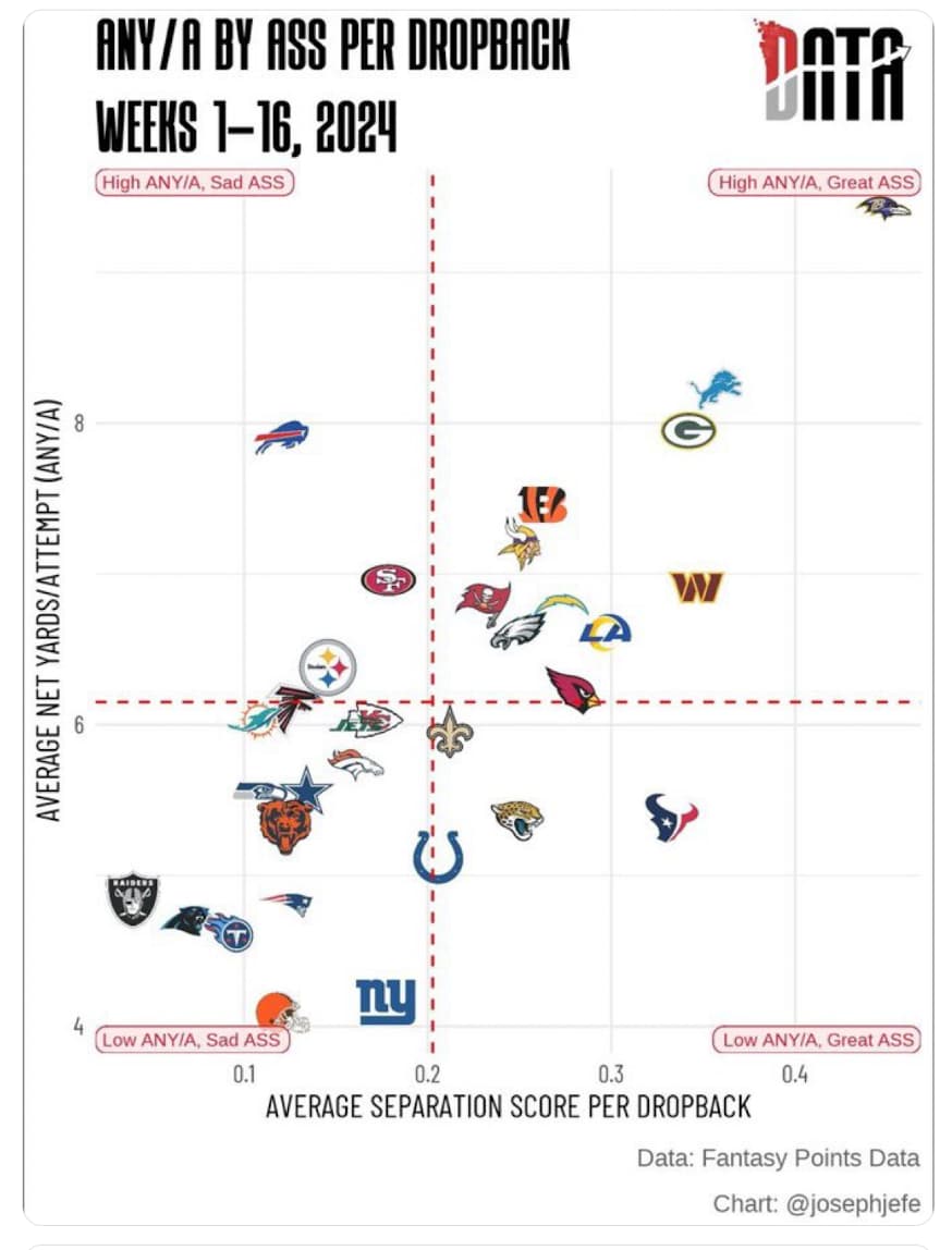 I think that’s the result of Henry. Defenses are terrified of Henry and Lamar’s legs. Play action is stealing candy from a baby. Guys wide ass open all over the field. That’s what happens when you rush for 3000 yards.
