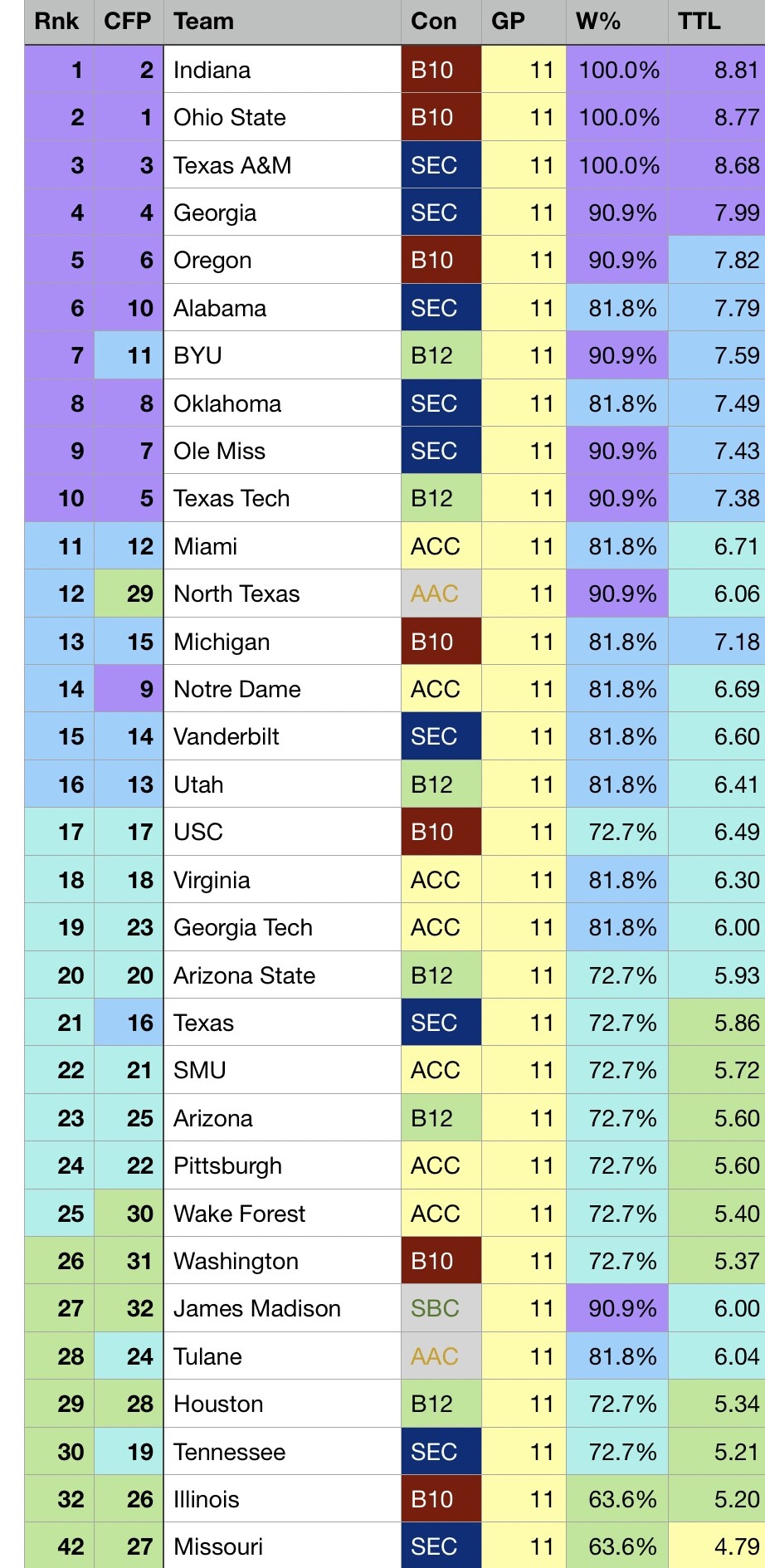 Everyone else is with a few spots (N texas is high because they are the last team in the CFP because GO5 or they would be around that mark)