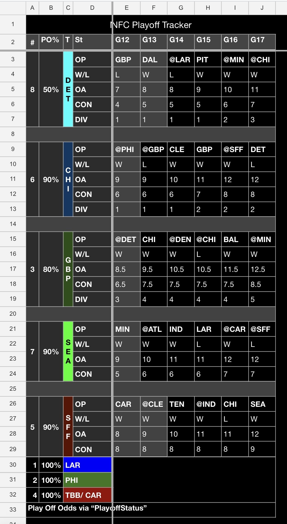 I’ve conceded the division at this point… I believe the most likely scenario for the Lions to get into the playoffs is GB beats the Bears twice, that makes week 18 a win or go home game for the 7th seed. That’s assuming the Lions go 2-1 down the stretch