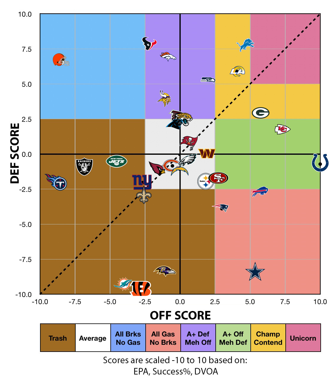 So i went through and took each teams DVOA, EPA and Success% for offense and defense. Put them into a scale -10 to 10. Where 0 is average and the tens are best and worst.