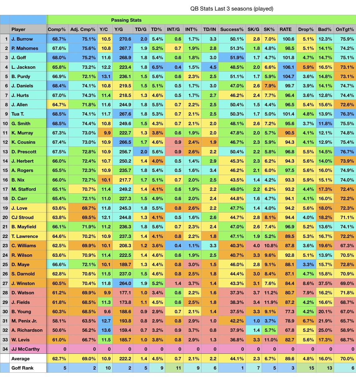 Recorded their stats from the last 3 seasons played (IE Rodgers didnt play in 2023. So 2024, 2022, 2021)