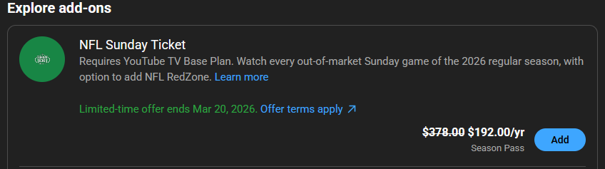For those that might be interested. Just saw this in my YoutubeTV “Add Ons” for 2026 NFL Sunday Ticket.