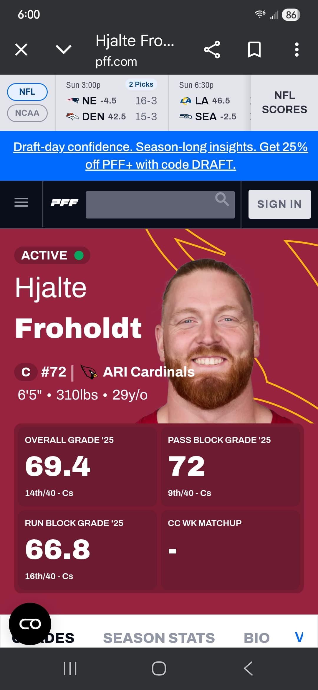 Hjalte Froholdt will be 30 in 2026. He is a top ten center right now but he was a late bloomer. A solid NFL player in the last year of his deal. Has been very good and has started every game the last three seasons.