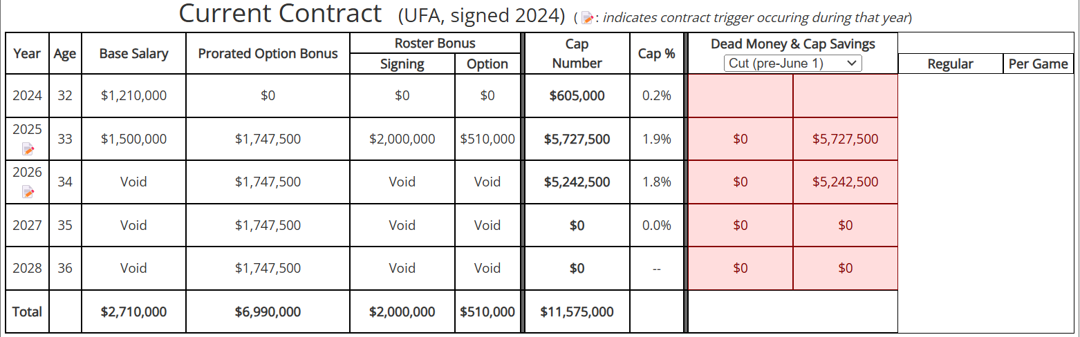 Since Z has 3 void years in his contract, that gets spread among them (and 2025) for cap purposes. So ~$1.75m is applied to each year. When a contract ends, void years accelerate, so that’s why he would carry a dead cap charge of ~$5.2m in 2026.