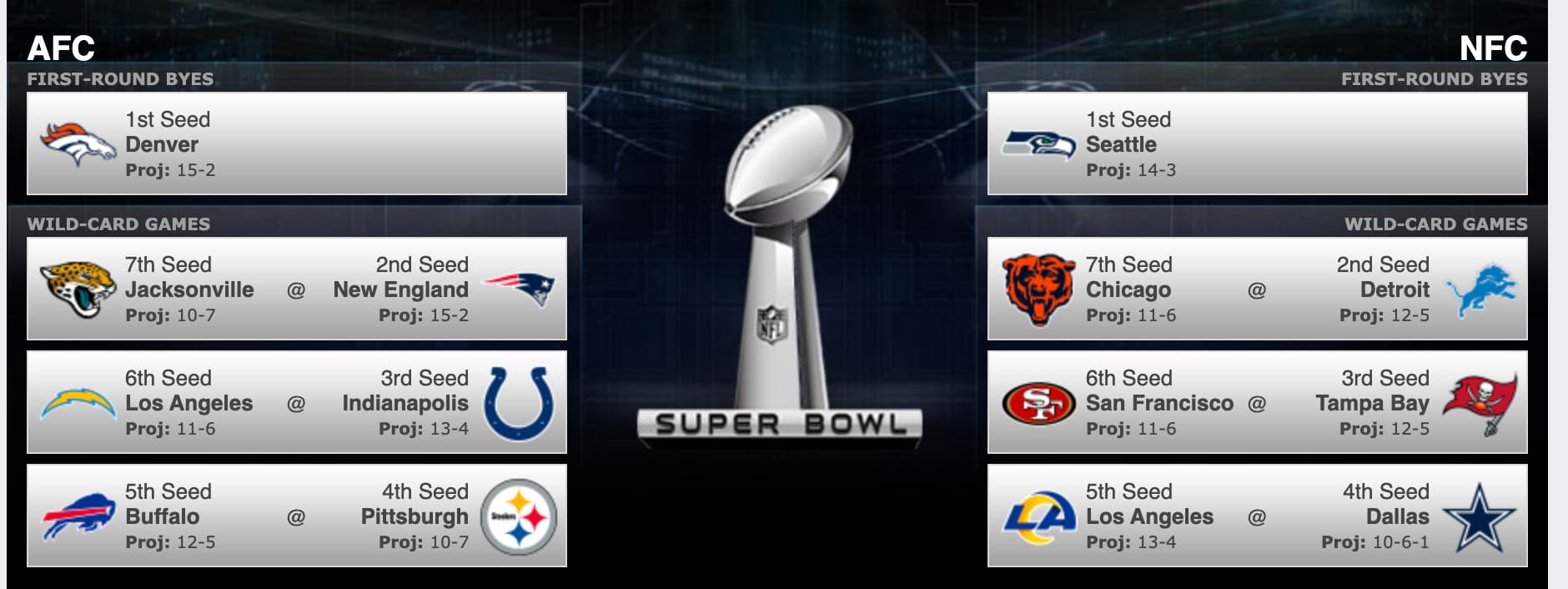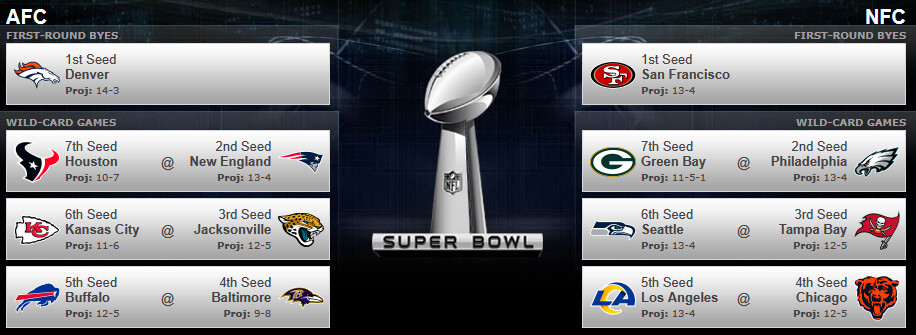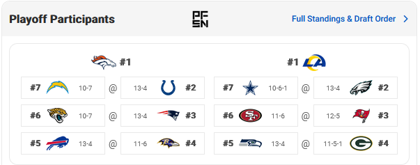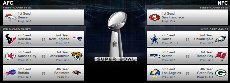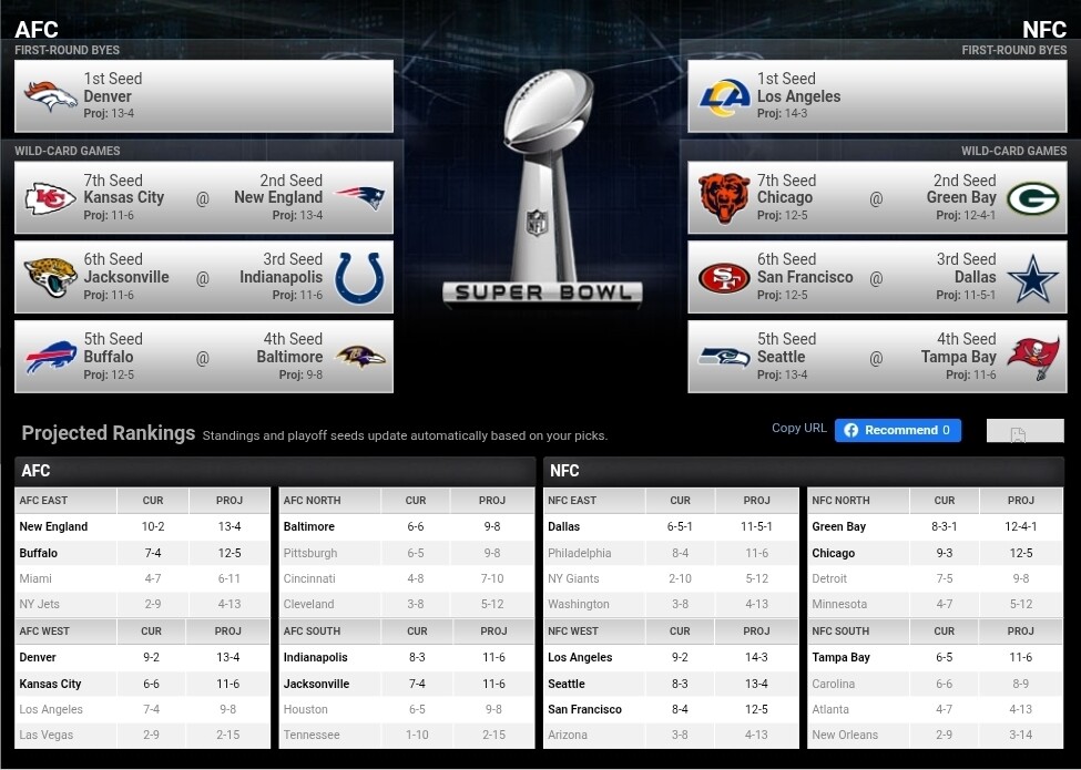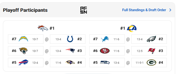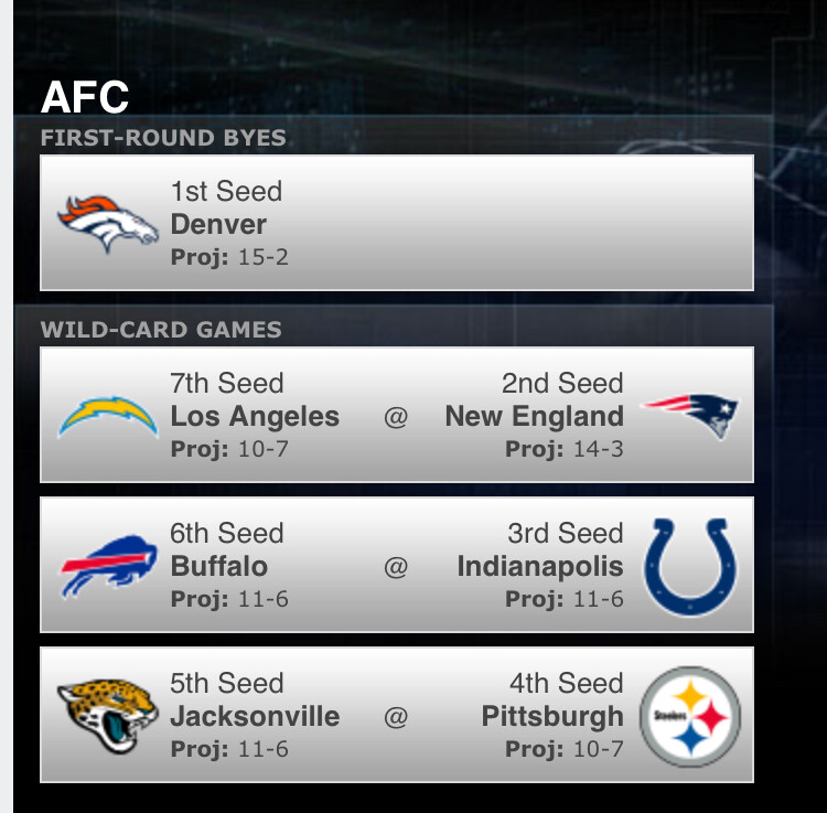 This is always fun. I have us losing to the Rams. 11-6 still only lands us the 7 seed. I tried picking logically, and not with my heart. If so, KC wouldn’t be in there.