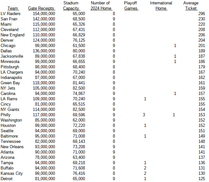 So Forbes just came out with their annual NFL valuations and in those figures, they have the gate receipts for all teams. NFC had 9 home games and there were 5 international games. Based on those figures, the average ticket price is as follows: