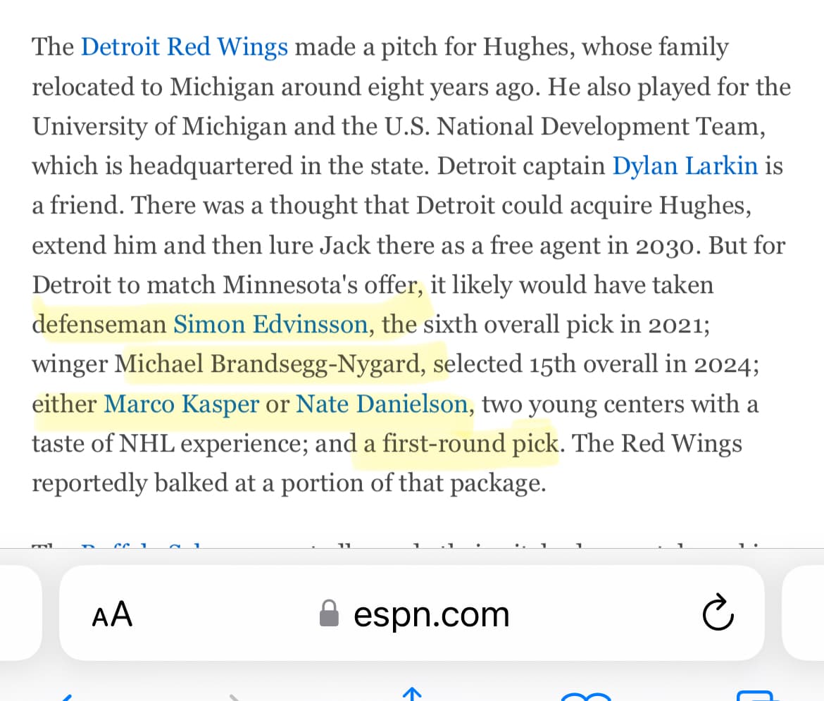 For all of the people who still think the Wings really are trying to build a winner, here is even more proof that it’s a straight lie. They had a chance to get a star player, who wanted to be here, but they refused to do the deal. They said it was because of Edvinsson? Not even close. It’s because Hughes will demand a lot of money. Illitch is only interested in signing guys who are dirt cheap fringe players. Just like the Tigers, Chris Illitch has no interest in paying and investing to win. It’s all about how to run the franchises as cheap as possible, while still being able to sell the mirage that they are trying to win. They would rather lose cheap than win while paying.