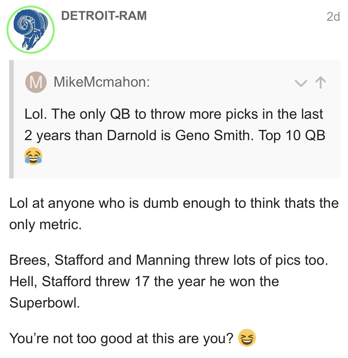 He played amazing to get them to the SB. He’s earned the right to play for it and in the biggest game he did a lot to get them there. But his season was average at best. Point out the positives all you want, I’m also stating facts. Their defense is the reason they had the season they had. There are reasons he put up the numbers he did…context. I’m not going to great lengths to discredit the guy. Most years Lamar Jackson has a higher passer rating than Matt Stafford. Is he the better passer? Hell no! The reasons why absolutely matter.