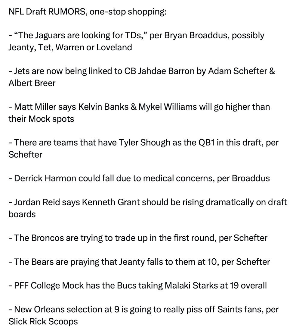 Yeah, could be, but if he’s talking to the Pats/Jags/Raiders, then it’s not for Tet, it’s for Jeanty. That’s what I mean, it’s a tell. We won’t know from the outside looking in, but the teams will know.
