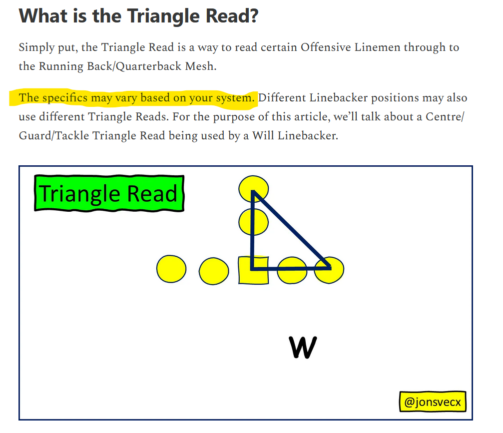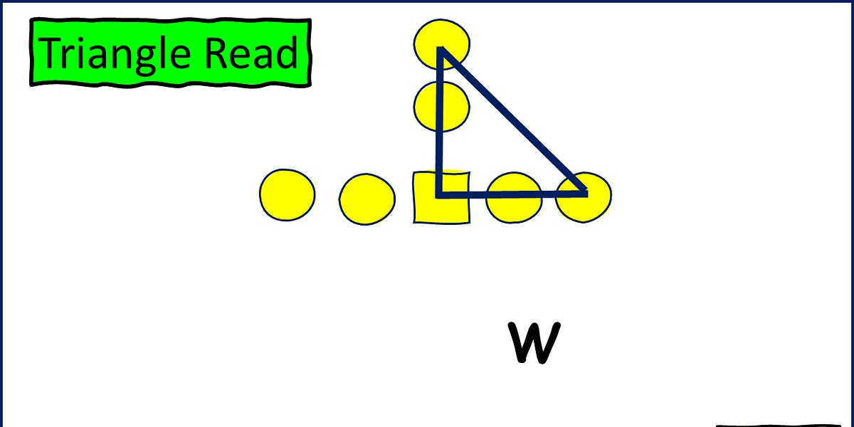 I am not a football coach, but here is a good article that explains the triangle read concepts for both the offensive side and what they are trying to do, and what the defense is seeing, keying on and what they are trying to do.