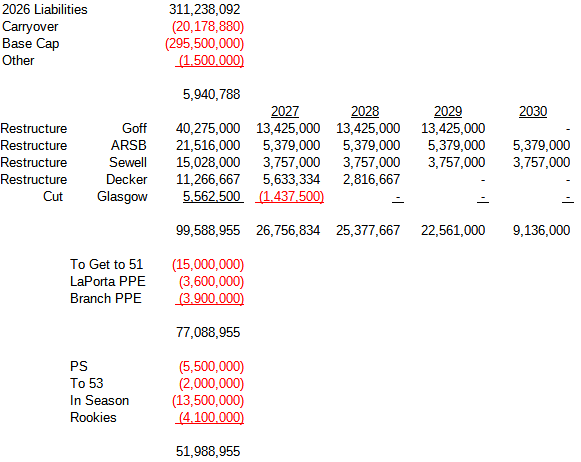 That would give us $52M, which is probably way more than we will need. I don’t see us doing Decker (too near end of career, Lions tend to like to restructure players that will be here a while) and probably won’t do either Sewell/ARSB right away.