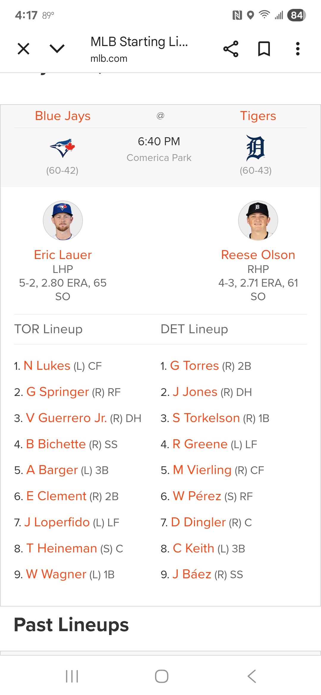 Probables: Thursday — LHP Eric Lauer (5-2, 2.80) vs. RHP Reese Olson (4-3, 2.71); Friday — RHP Jose Berrios (6-4, 3.87) vs. RHP Keider Montero (4-2, 4.28); Saturday — RHP Kevin Gausman (7-7, 4.01) vs. LHP Tarik Skubal (10-3, 2.19); Sunday — RHP Max Scherzer (1-0, 5.14) vs. RHP Jack Flaherty (5-10, 4.77).