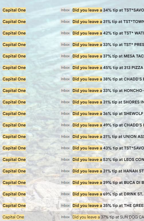 I usually tip around 30%. Most of the restaurants I go to aren’t expensive. The server would probably have to personally insult me to get a tip under 20%.