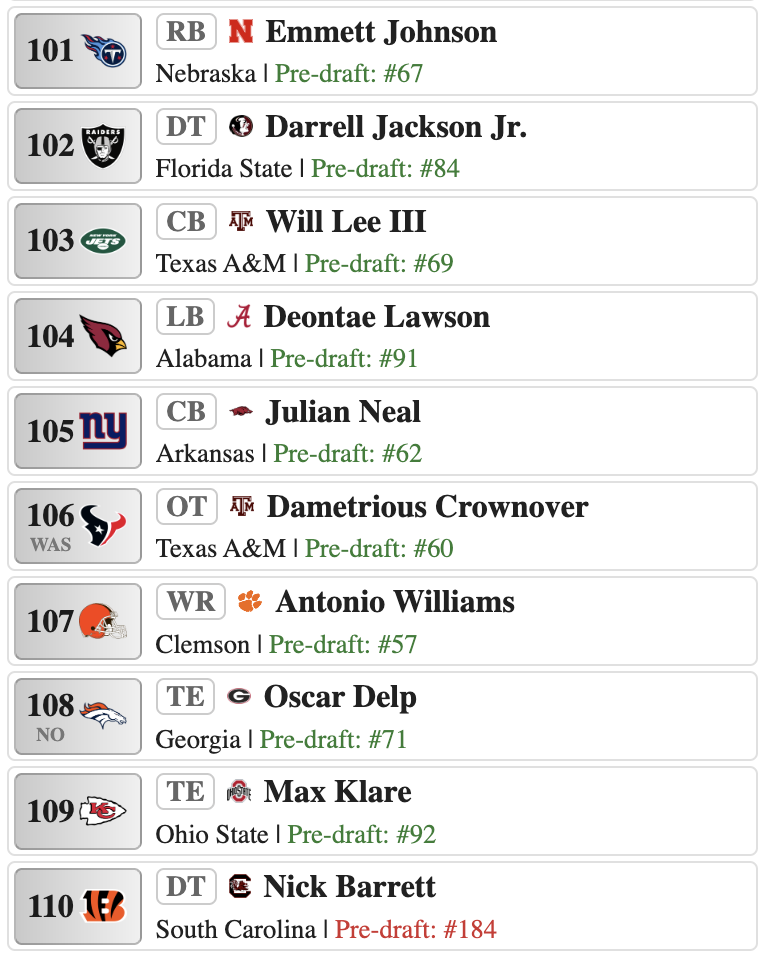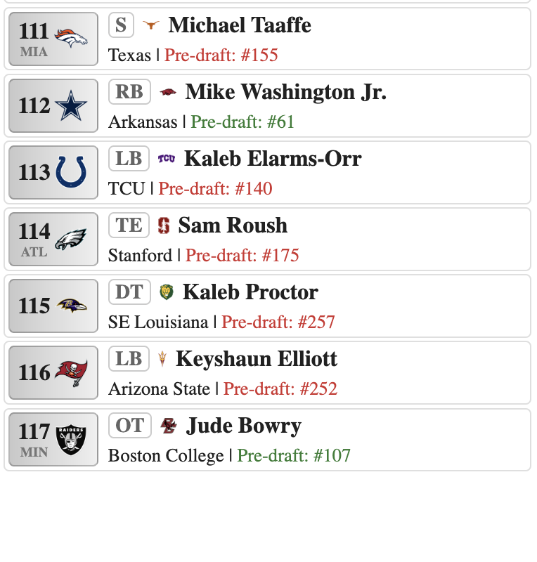 So I got asked to play out the 4th round to our pick then post some options for us, so I did. I picked the guys mentioned in the last thread as “what I would have done if the draft kept going,” where I could, but otherwise used a combo of needs/taking players I thought would never make it our pick anyway, for some realism. So don’t get too worked up if I took someone you wouldn’t take!