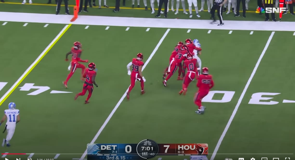 The Lions offense runs a lot of swing and bubble passes and this played into the Texans wide 9. From the wide 9 the Texans consistently had an edge guy in those throwing lanes. The way you beat the wide 9 is by vertical passes like slants and by attacking the middle. Which the Lions did later in the game. Those adjustments were crucial to our success.