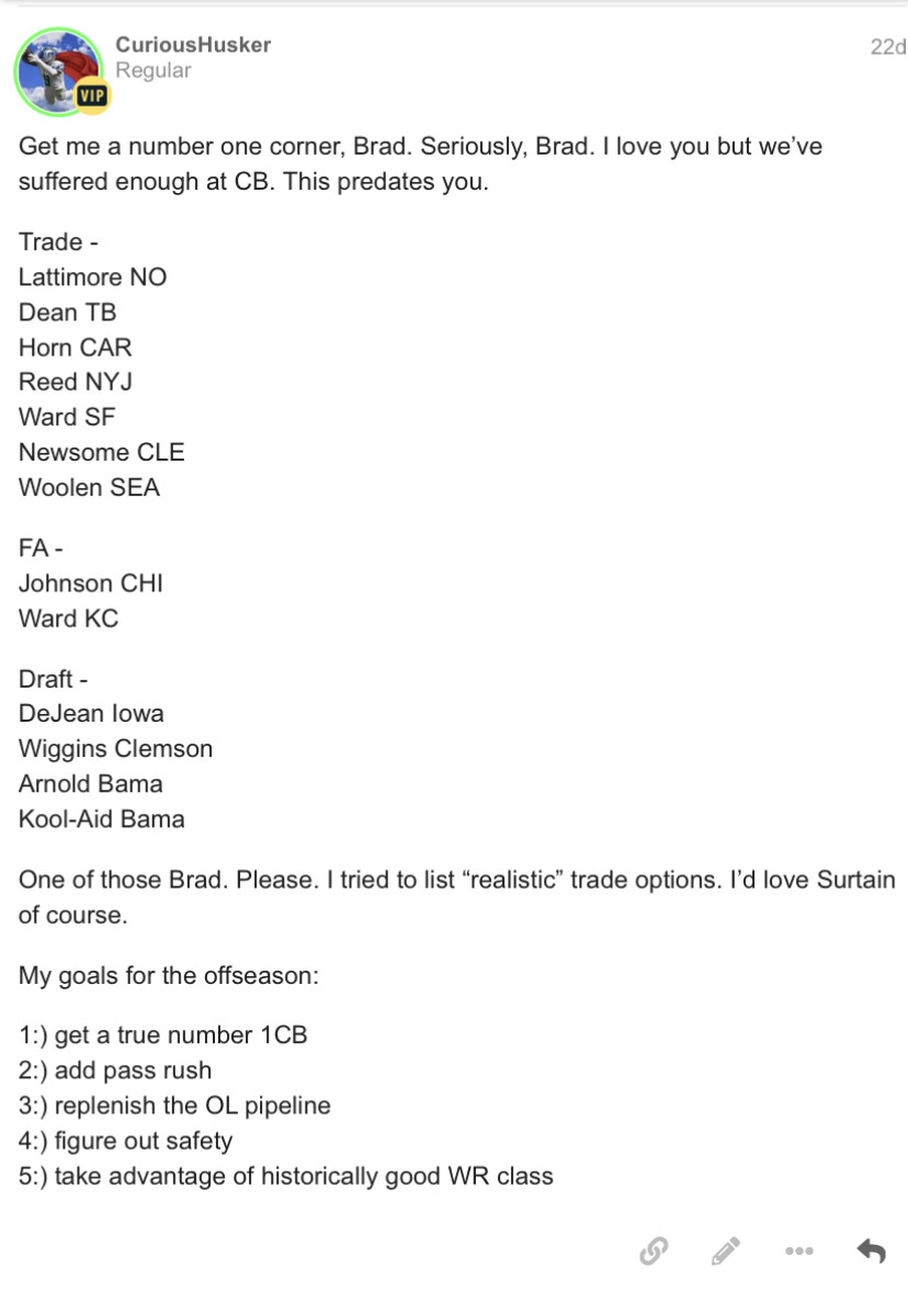 Way too early to tell. My top of mine list from a month ago. I’ve been trying to shake the DL group into realizing that outside CB is the Achilles heal here. We get a one and slide Sutton to 2 and we’re in decent shape.